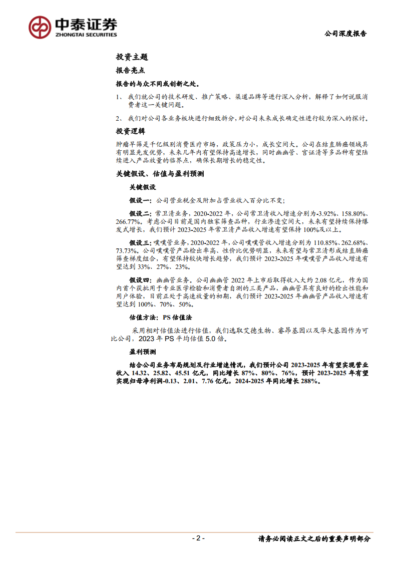 报告预测,“常卫清”作为独占性龙头产品,其业绩将迎来爆发期。参考海外可比产品Cologuard的推广进展,并考虑到中国更广泛的筛查受众群体和较低的普及率,预计到2025年,中国结直肠癌高风险人群将达到约1.42亿人。假设按照2年/次的筛查周期计算,预计到2025年,“常卫清”的市场渗透率有望达到约4-5%,销售体量有望突破30亿元,2022-2025年复合增速有望超过100%。