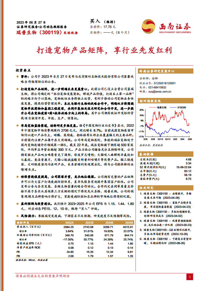 根据西南证券的盈利预测,瑞普生物在2023年至2025年的业绩将实现显著增长。预计公司2023年、2024年、2025年的营业收入将分别达到27.43亿元、32.90亿元和40.16亿元,同比增长31.61%、19.93%和22.07%。归属于母公司净利润预计分别为5.40亿元、6.72亿元和8.45亿元,同比增长55.77%、24.39%和25.74%。对应的每股收益(EPS)分别为1.15元、1.44元和1.80元,动态市盈率(PE)分别为15倍、12倍和10倍。鉴于公司在宠物和动保领域的双重布局及强劲增长潜力,报告维持“买入”评级。
