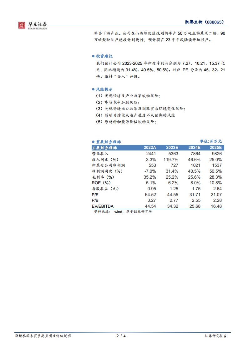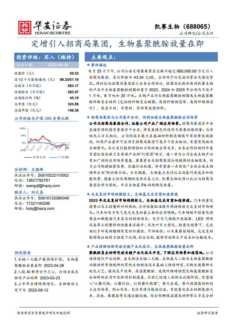 凯赛生物凭借在生物制造技术上的持续创新,成功突破了生物基聚酰胺复合材料的关键产业化技术,使其在高温聚酰胺、连续纤维增强型复合材料等领域取得积极进展。随着汽车轻量化、新能源、风电、电子电气及集装箱等下游市场对高性能、环保材料需求的增长,生物基尼龙凭借其成本和性能优势,有望加速替代传统石油基材料。华安证券研究所预计公司2023-2025年归母净利润将实现31.4%、40.5%和50.5%的强劲增长,维持“买入”评级。