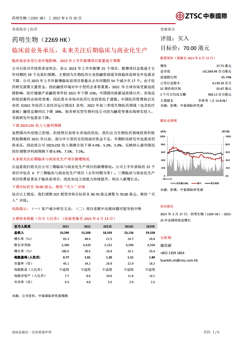 药明生物在2023年上半年面临生物医药行业投融资放缓带来的临床前业务压力,导致新增项目数量不及预期,并促使分析师下调了2023-2025年的收入与盈利预测。然而,公司正积极调整战略重心,成功获取了更多高价值的三期临床与商业化生产项目,这预示着未来新的增长动力。尽管目标价被下调至70.00港元,但鉴于公司在后期业务的增长潜力以及当前股价的吸引力,分析师维持了“买入”评级,并提醒投资者关注研发支出减少和项目中断等潜在风险。公司未来的表现将主要取决于其在后期临床与商业化生产领域的持续拓展能力。