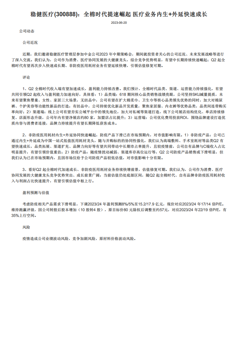 稳健医疗作为大健康领域的领先企业,其全棉时代和非防疫医用耗材两大核心业务预计将从Q2起实现加速增长,驱动公司整体业绩向好。尽管防疫产品需求下滑导致2023/24年盈利预测有所下调,但该影响已在市场预期内,且公司核心业务的强劲增长潜力有望引领估值修复。维持“跑赢”评级,并设定除权后目标价57元,预示35%的上行空间。投资者需关注疫情影响、市场竞争及原材料价格波动等潜在风险。