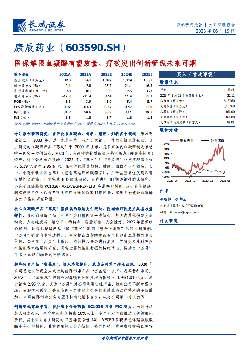 康辰药业凭借其国家一类创新药“苏灵”在医保解限后的放量潜力,以及骨质疏松用药“密盖息”的稳健增长,构筑了坚实的基本盘。同时,公司在创新药研发领域持续投入,抗肿瘤小分子药物KC1036在关键临床阶段展现出卓越疗效,具备广阔的商业化前景。这些核心驱动因素共同支撑了公司未来的业绩增长。报告预测公司2023-2025年营业收入将分别达到10.89亿元、13.19亿元和15.37亿元,归母净利润分别为1.39亿元、1.55亿元和1.73亿元。鉴于公司核心产品的市场竞争力、多元化的产品布局以及创新管线的巨大潜力,报告首次覆盖并给予“买入”评级,看好公司长期发展。然而,投资者仍需关注产品销售不及预期、新药研发失败或进度低于预期、行业政策变化以及市场竞争加剧等风险。