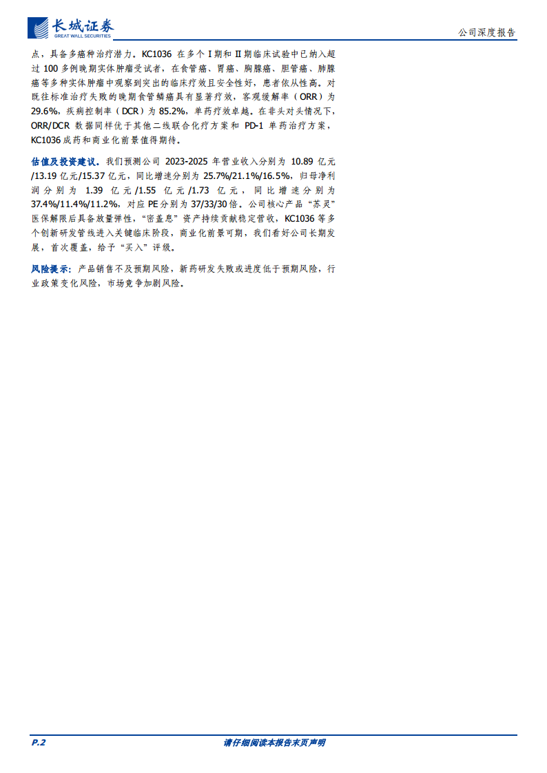 康辰药业持续加大研发投入,研发费用率保持在10%以上,构建了覆盖妇科、肿瘤、凝血等多个领域的丰富创新管线。其中,自主研发的抗肿瘤小分子药物KC1036(AXL/VEGFR2/FLT3多激酶抑制剂)在晚期食管鳞癌的II期临床试验中展现出卓越疗效和良好安全性,具备First-in-Class(FIC)潜力,商业化前景广阔。基于核心产品的放量潜力、密盖息的稳定贡献以及创新管线的突破,报告预测公司2023-2025年营业收入和归母净利润将实现稳健增长,首次覆盖给予“买入”评级。