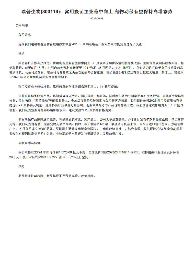 瑞普生物在2023年展现出多元化业务的增长潜力。禽用疫苗主业在养殖利润改善和战略合作的推动下,预计将稳健向上。猪用疫苗业务凭借丰富的产品线和优质的客户服务,有望在下半年加速增长。宠物动保业务作为公司高成长的新引擎,通过产品创新和渠道建设,预计将实现收入翻倍,并具备广阔的中长期发展前景。尽管原料药及制剂业务面临短期市场压力,但公司整体盈利预测保持不变,并维持“跑赢行业”评级,显示出市场对其未来发展的积极预期。同时,公司也需关注养殖行业波动、新品拓展及政策变化等潜在风险。