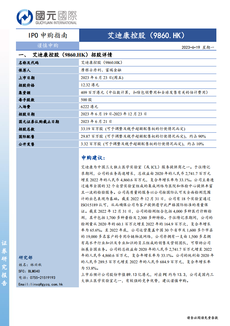 艾迪康控股(9860.HK)的招股详情显示,公司由摩根士丹利和富瑞金融担任保荐人,计划于2023年6月23日(周五)上市。招股价格定为12.32港元,预计集资额为409百万港元(中位数计算,扣除相关费用)。每手股数为500股,入场费为6222港元。本次招股总数为33.19百万股,其中国际配售占约90%(29.87百万股),公开发售占约10%(3.32百万股)。国元证券的认购截止日期为2023年6月21日。