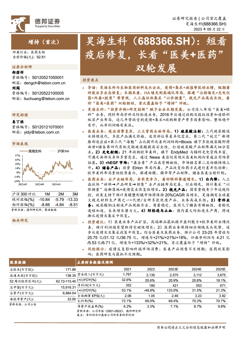 昊海生科作为生物医用材料领域的领先企业,正积极通过“投资并购+研发创新”策略,构建“医美+医药”双轮驱动的长期发展格局。短期内,公司受益于疫后消费复苏,医美业务展现出强劲的增长势头,玻尿酸产品高端化布局、光电医美设备拓展以及肉毒素、胶原蛋白等前瞻性赛道布局,共同推动医美板块实现突破性增长。长期来看,公司在眼科领域通过人工晶状体“以价换量”巩固市场份额,并凭借视光产品(特别是角膜塑形镜和PRL晶体)的稀缺性及政策支持,实现高成长性。同时,公司在骨科和防粘连等细分医药领域保持领先地位,为整体业绩提供稳固支撑。