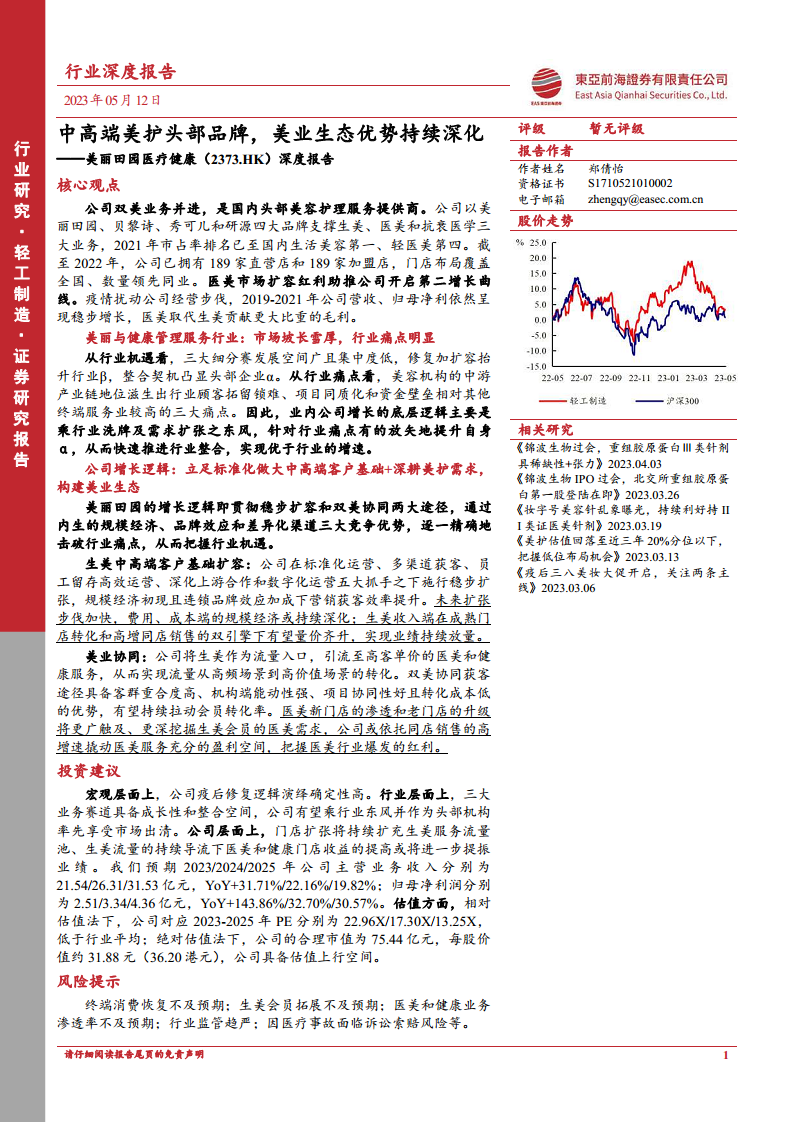 基于疫情管控放开、终端消费复苏、门店扩张、高效运营及渗透率提升等核心假设,报告预测美丽田园2023/2024/2025年主营业务收入将分别达到21.54/26.31/31.53亿元,同比增长31.71%/22.16%/19.82%。归母净利润预计分别为2.51/3.34/4.36亿元,同比增长143.86%/32.70%/30.57%。在估值方面,相对估值法显示公司2023-2025年PE分别为22.96X/17.30X/13.25X,低于可比公司平均水平,具备估值上行空间。绝对估值法(FCFE)测算公司合理市值为75.44亿元,每股价值约31.88元(36.20港元),进一步印证了估值上行潜力。