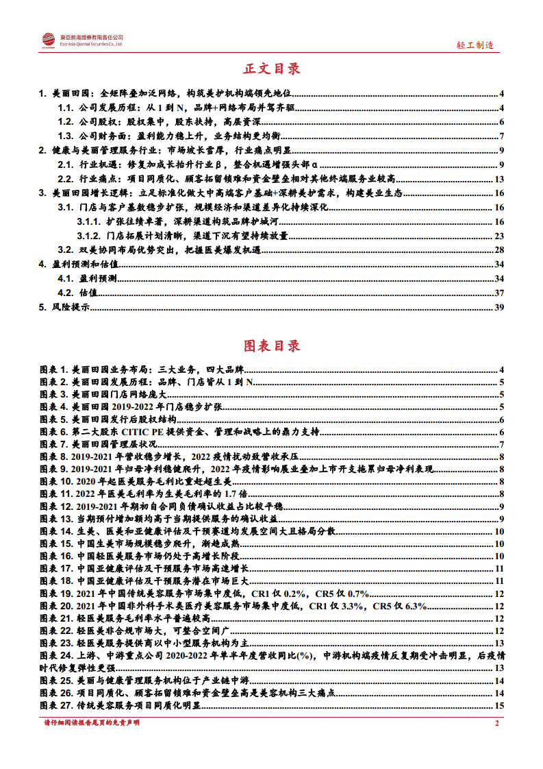 本报告核心观点指出,美丽田园医疗健康(2373.HK)作为国内领先的美容护理服务提供商,凭借其“双美”业务(生活美容与医疗美容)协同发展,已在行业中构筑起显著的竞争优势。公司旗下四大品牌(美丽田园、贝黎诗、秀可儿、研源)全面覆盖生美、医美和抗衰医学三大业务,并在2021年分别位列中国生活美容市场第一和轻医美市场第四。公司通过稳步的门店扩张(截至2022年拥有189家直营店和189家加盟店,覆盖全国105个城市)和深化的美业生态布局,有效应对行业痛点,把握市场机遇。