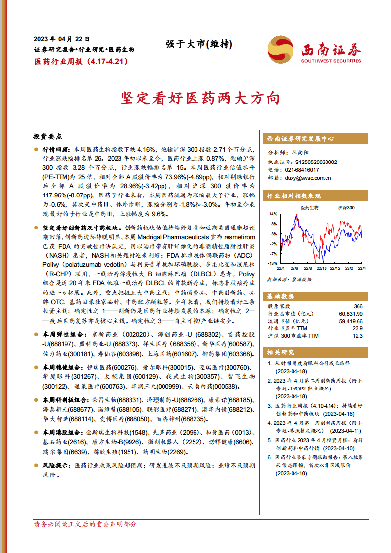 报告强调,在当前市场环境下,投资者应坚定把握医药行业的确定性投资主线。这包括以创新为本源的持续发展、疫后医药消费和服务的复苏,以及自主可控/产业链安全的重要性。同时,报告也警示了医药行业可能面临的政策风险超预期、研发进展不及预期以及业绩不及预期等潜在风险,提醒投资者在追求增长的同时,需审慎评估和管理风险。