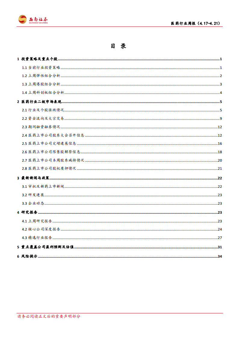 报告提示了医药行业可能面临的风险,包括政策风险超预期、研发进展不及预期风险以及业绩不及预期风险。