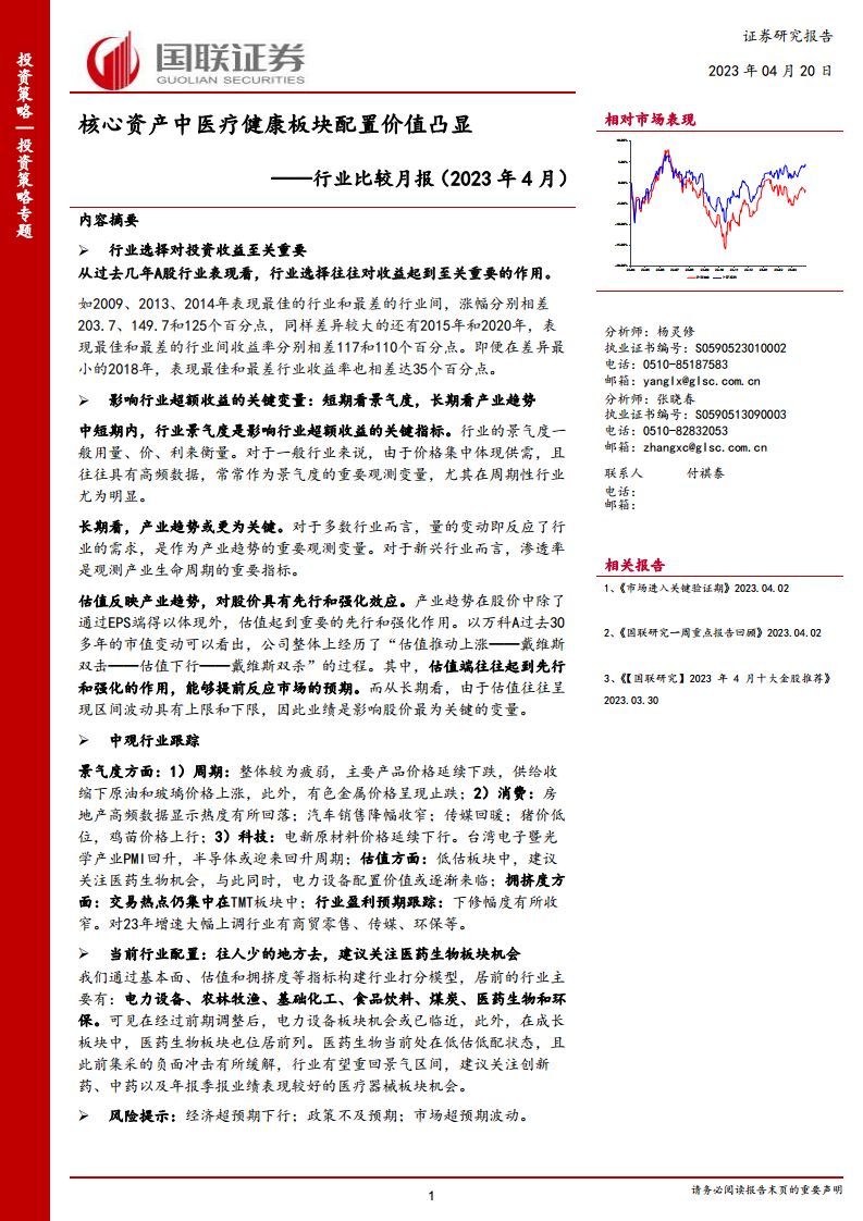行业比较月报(2023年4月):核心资产中医疗健康板块配置价值凸显