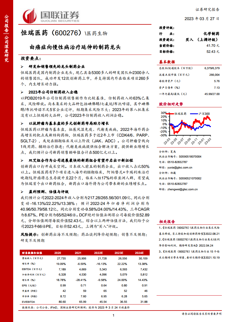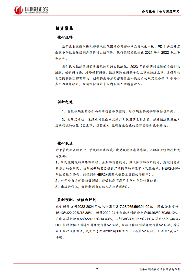 本报告的核心观点在于,恒瑞医药作为国内领先的制药企业,正通过其强大的研发和销售能力,以及从癌症治疗向慢性病领域的多元化创新药布局,实现业绩的稳健增长和国际市场的拓展。尽管面临集采和医保谈判带来的短期压力,但公司已成功消化大部分风险,并有望凭借其丰富的创新药管线和国际化战略,开启新的增长周期。