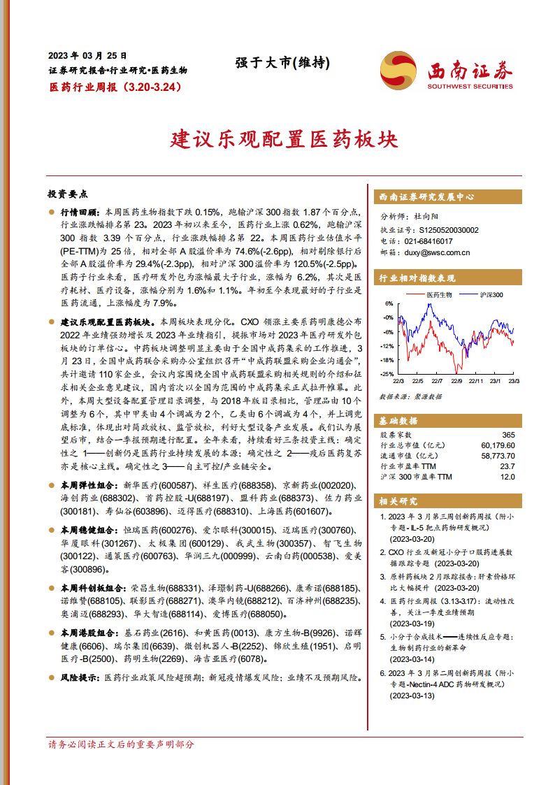 本报告对2023年3月20日至3月24日期间的医药生物行业表现进行了专业而深入的分析,并提出了乐观的配置建议。尽管本周医药生物指数整体跑输大盘,但细分领域表现分化,医疗研发外包(CXO)和医疗设备等子行业展现出强劲增长势头。报告强调,展望后市,医药行业将围绕三大核心投资主线持续发展:创新驱动、疫后复苏以及自主可控/产业链安全。政策层面,中成药集采的推进和大型设备配置管理目录的调整,预示着行业结构性变革与发展机遇并存。
