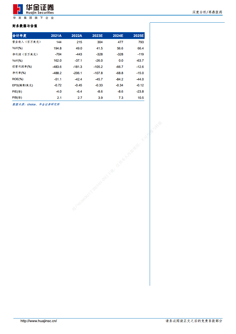 基于对已上市产品及重磅临床后期产品的营业收入预测,报告预计再鼎医药2023-2025年将实现营业收入304.22/476.56/792.82百万美元,同比增长41%/57%/66%。采用DCF估值法,假设WACC为11.5%,永续增长率为3%,公司合理估值为61.3亿美元,对应股价为49.1港元。首次覆盖,给予“买入”评级。