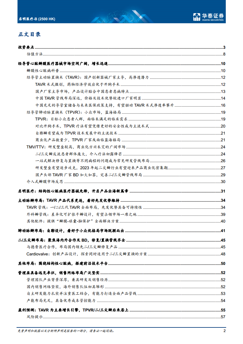 本报告核心观点指出,启明医疗作为中国经导管介入瓣膜创新器械市场的先行者和龙头企业,凭借其全面的产品管线、强大的研发能力、深厚的医生及KOL资源积累以及积极的国际化战略,有望在中国乃至全球结构性心脏病市场中持续保持领先地位并实现高速增长。公司在TAVR领域拥有显著的先发优势和持续迭代的产品线,同时在TPVR和二/三尖瓣市场通过差异化产品设计和海内外合作布局,展现出巨大的增长潜力。