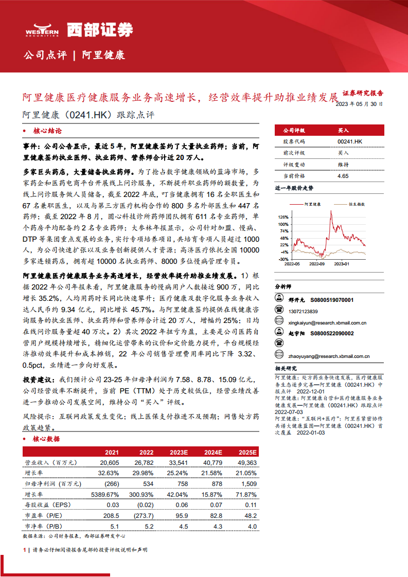 报告强调,阿里健康在2022年成功扭亏为盈,这主要得益于其经营效率的显著提升,包括医药自营用户规模的持续扩大、议价和定价能力的增强,以及平台规模经济效应带来的成本摊销。公司销售管理费用率的下降进一步印证了其运营效率的优化,为未来的盈利增长奠定了坚实基础。
