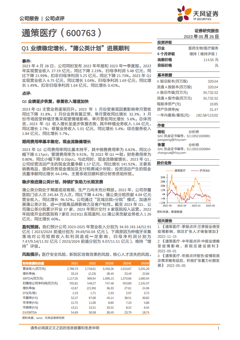 通策医疗(600763):Q1业绩稳定增长,“蒲公英计划”进展顺利