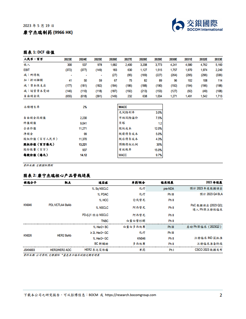 鉴于KN046在NSCLC适应症上的审批延迟,交银国际对康宁杰瑞制药的财务预测进行了相应调整,下调了KN046、KN026和KN035的销售峰值预测,并修正了2023年至2025年的收入预期。尽管短期内收入预测有所下调,并导致目标价从16.22港元调整至14.12港元,但交银国际维持了“买入”评级。这表明分析师认为,尽管面临短期挫折,康宁杰瑞制药凭借其差异化的产品管线、在未满足医疗需求领域的战略布局以及现有产品的优异临床数据,仍具备显著的长期增长潜力和投资价值。