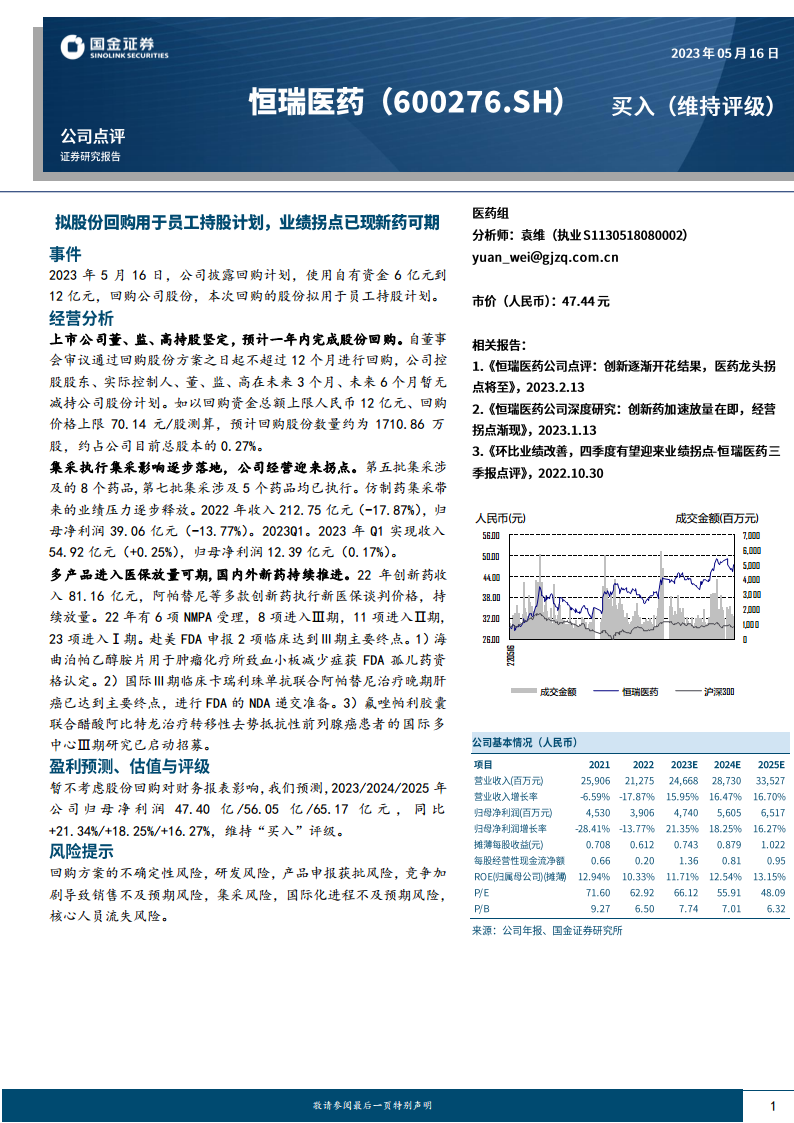 公司通过实施股份回购计划,旨在提振市场信心并激励员工,同时,在经历集采政策的调整期后,2023年第一季度业绩已呈现积极回暖态势,预示着经营拐点的到来。公司在创新药研发方面持续投入并取得显著成果,多款创新药在国内市场表现强劲,且国际化战略取得突破性进展,多项新药在海外进入关键临床阶段,为全球市场拓展奠定基础。财务预测显示,公司未来几年盈利能力将保持稳健增长,分析师维持“买入”评级。尽管公司面临回购不确定性、研发、市场竞争、集采、国际化进程及核心人员流失等多方面风险,但其创新驱动和全球化布局战略有望支撑其长期发展。