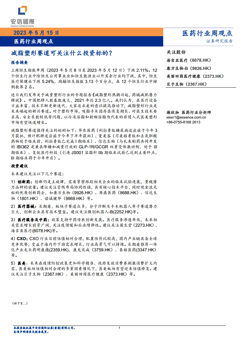 医药行业周观点:减脂塑形赛道可关注什么投资标的?