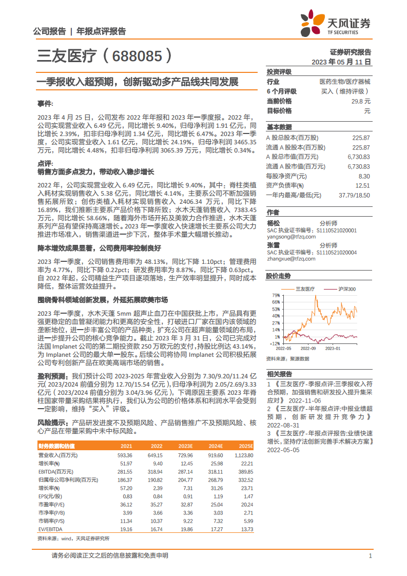 2023年4月25日,三友医疗发布2022年年报和2023年一季度报。