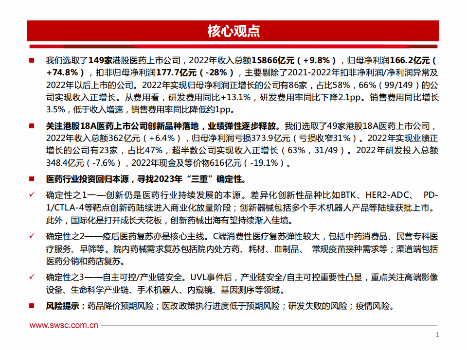 创新被视为医药行业持续发展的本源。2022年,港股18A医药上市公司(49家)总收入362亿元,同比增长6.4%,归母净利润亏损373.9亿元,但亏损幅度收窄31%。这些公司研发投入总额为348.4亿元,同比下降7.6%,反映出企业在研发策略上更加聚焦核心管线,以缓解现金压力。展望2023年,行业投资将回归本源,聚焦“三重”确定性:一是创新仍是核心,差异化创新品种和器械的商业化放量以及国际化出海是重要增长点;二是疫后医药复苏,C端消费性医疗、院内药械需求及渠道端均有望迎来弹性修复;三是自主可控/产业链安全,高端影像设备、生命科学产业链、手术机器人等领域将受到重点关注。