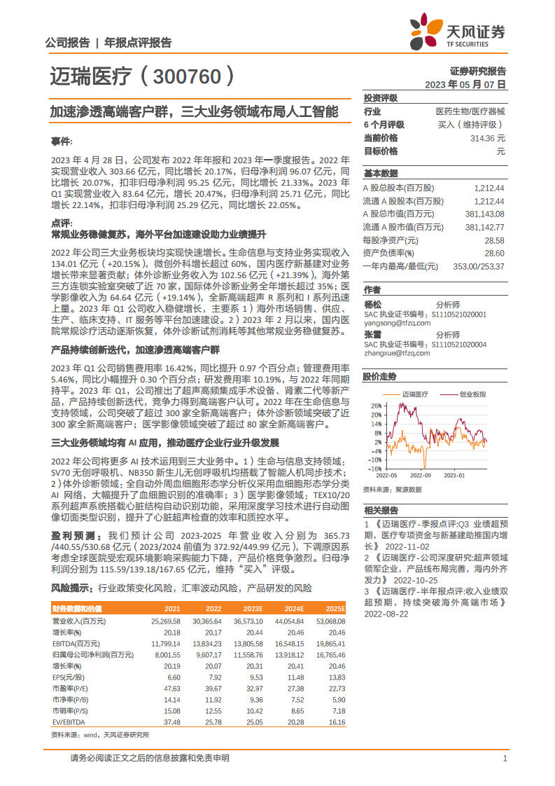 迈瑞医疗在2022年及2023年第一季度展现出强劲的财务增长和市场拓展能力,营业收入和归母净利润均实现超过20%的同比增长。这主要得益于国内常规诊疗活动的稳健复苏、海外市场销售及服务平台的加速建设,以及公司在生命信息与支持、体外诊断和医学影像三大核心业务领域对高端客户群的持续渗透。公司通过持续的产品创新迭代,并积极将人工智能技术深度应用于其三大业务领域,显著提升了产品竞争力、诊断准确率及检查效率,从而推动了医疗行业的智能化升级。尽管面临全球医院采购能力下降和产品价格竞争加剧的挑战,分析师仍维持“买入”评级,肯定了其长期投资价值。然而,投资者仍需关注行业政策变化、汇率波动及产品研发等潜在风险。