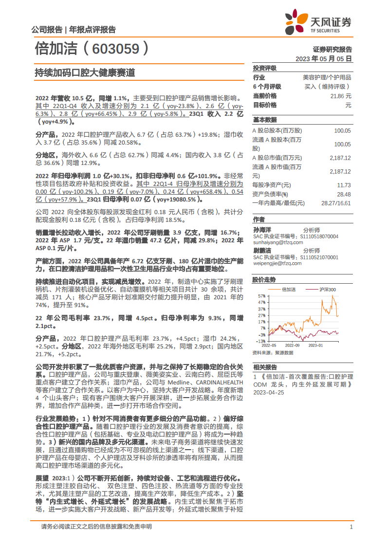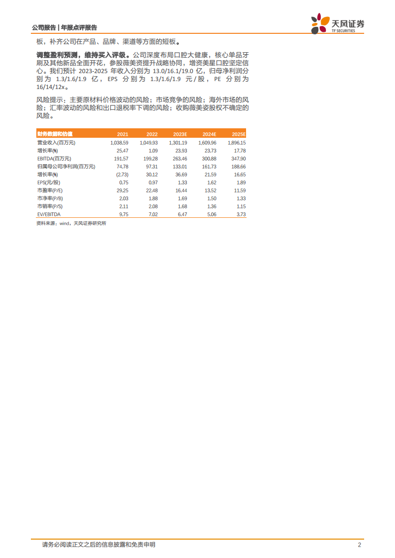 公司展望2023年将持续开拓创新,优化设备、工艺和流程,提升生产效率和降低成本。 公司将坚持“内生式增长、外延式增长”的发展战略。内生式增长聚焦于市场拓展、大客户开发和新产品开发;外延式增长则通过补短板,补齐公司在产品、品牌、渠道等方面的不足。 公司深度布局口腔大健康,核心单品牙刷及其他新品全面开花,参股薇美姿提升战略协同,增资美星口腔坚定信心。 天风证券预计公司2023-2025年收入分别为13.0/16.1/19.0亿元,归母净利润分别为1.3/1.6/1.9亿元,维持“买入”评级。 风险提示包括主要原材料价格波动、市场竞争、海外市场、汇率波动、出口退税率下调以及收购薇美姿股权不确定性等风险。