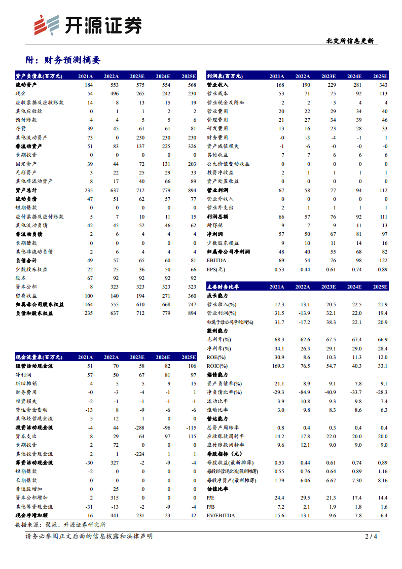 根据开源证券的盈利预测调整,预计公司2023-2025年的归母净利润分别为0.55亿元(原值0.69亿元)、0.68亿元(原值0.86亿元)和0.82亿元,对应每股收益(EPS)分别为0.61元/股、0.74元/股和0.89元/股。按照当前股价,对应的市盈率(P/E)分别为21.3倍、17.4倍和14.4倍。这些数据表明,尽管对未来两年的利润预测有所下调,但公司仍保持稳健的盈利增长预期,且估值水平趋于合理。