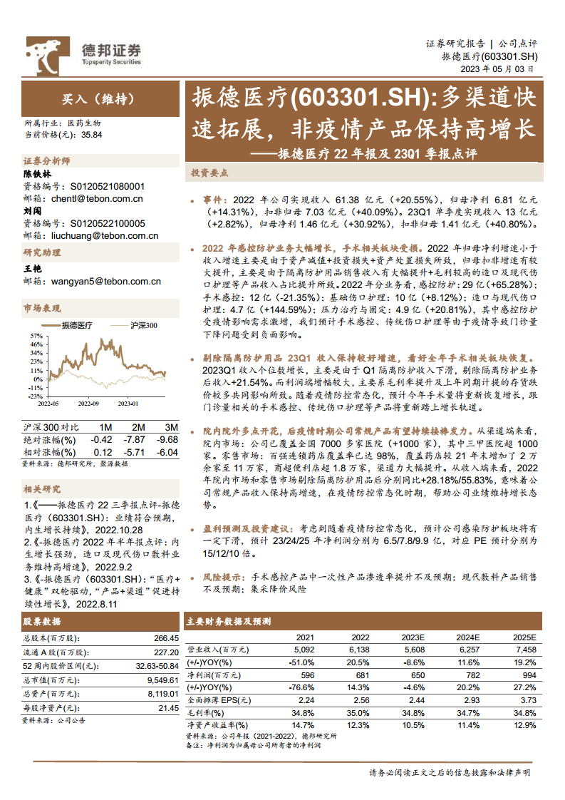 振德医疗在2022年及2023年第一季度表现出强劲的经营韧性和增长潜力。尽管疫情对部分业务板块造成短期冲击,但公司通过感控防护业务的爆发式增长以及高毛利现代伤口护理产品的快速放量,有效对冲了负面影响,并实现了扣非归母净利润的显著提升。在后疫情时代,公司成功实现了从疫情驱动向常规产品驱动的战略转型,剔除隔离防护用品后的常规业务收入保持高速增长。同时,公司在院内和零售渠道的深度拓展,显著增强了市场覆盖和渗透能力,为常规产品的持续发力提供了坚实基础。德邦研究所维持“买入”评级,并预计公司未来三年净利润将持续增长,显示出对公司长期发展的信心。尽管存在一次性产品渗透率、现代敷料销售及集采降价等风险,但公司凭借其优化的产品结构和强大的渠道网络,有望在医药生物市场中保持竞争优势。