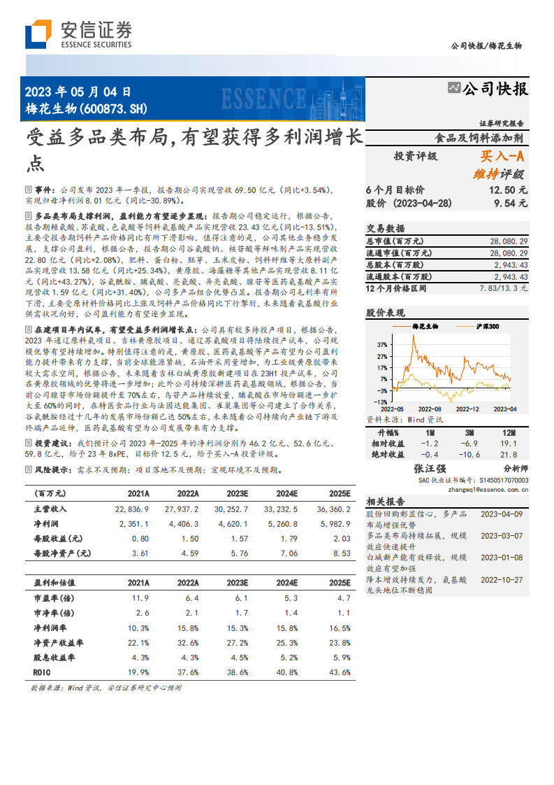 梅花生物在2023年第一季度面临饲料产品价格下行和原材料成本上升带来的盈利压力,导致归母净利润同比下降。然而,公司凭借其多元化的产品布局,特别是鲜味剂、大原料副产品、黄原胶及医药氨基酸等业务的稳健增长,展现出较强的经营韧性。展望未来,随着通辽原料氨、吉林黄原胶、通辽苏氨酸等在建项目的陆续投产,以及在黄原胶和医药氨基酸等高附加值领域的持续深耕和市场份额提升,公司有望受益于多利润增长点,逐步释放盈利潜力。安信证券维持“买入-A”评级,并给出12.5元的目标价,但同时提示了需求、项目落地及宏观环境等潜在风险。