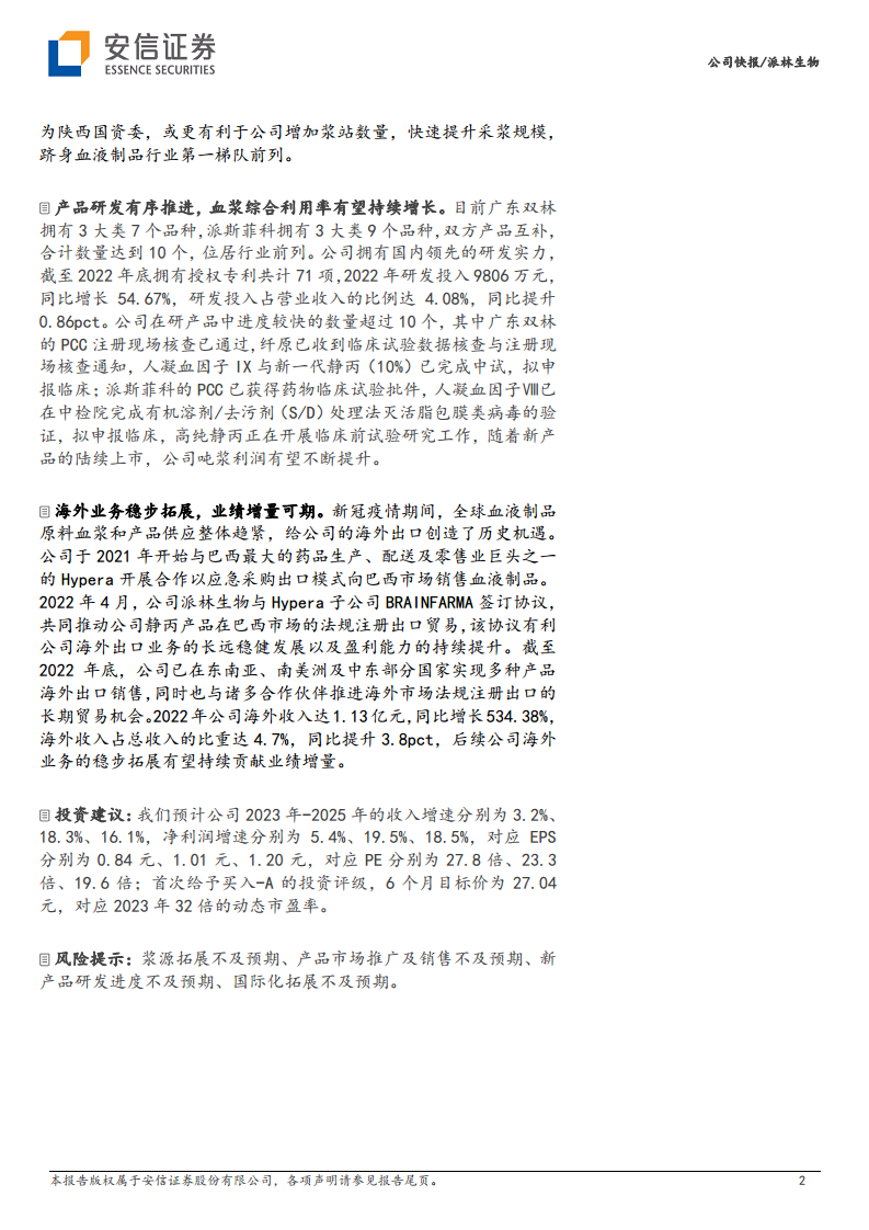 展望未来,派林生物的长期增长潜力显著。公司正稳步推进浆站建设,预计2023年采浆量将突破1,000吨。陕西国资委的拟入主将为公司带来强大的资源和政策支持,加速浆站拓展,助力公司在血液制品行业中占据更领先的地位。此外,公司持续加大研发投入,拥有丰富的产品管线和多款进展顺利的在研产品,有望提升血浆综合利用率和吨浆利润。海外业务的稳步拓展,尤其与巴西Hypera的合作,也预示着国际市场将成为公司业绩增长的新引擎。综合来看,尽管短期面临挑战,但派林生物凭借其战略布局、研发实力和市场拓展,有望实现持续稳健发展。