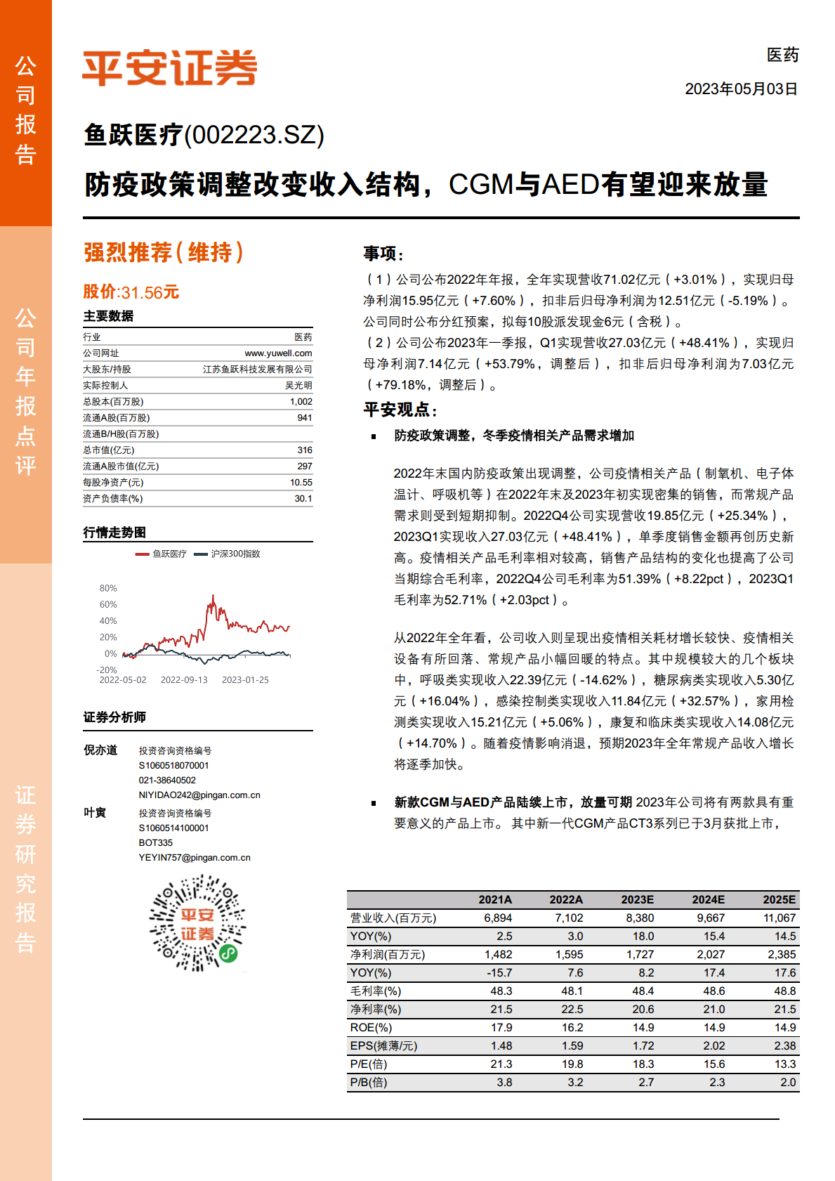鱼跃医疗在2022年末至2023年初受益于国内防疫政策调整,疫情相关产品销售激增,带动公司2023年第一季度营收和归母净利润分别实现48.41%和53.79%的显著增长,并提升了综合毛利率。尽管2022年全年扣非净利润有所下滑,但公司整体业绩表现出较强韧性。展望未来,随着新一代CGM产品CT3系列和国产化AED设备等重要新品的陆续上市,以及常规产品销售的逐步恢复,公司有望迎来新的增长周期。平安证券维持对鱼跃医疗的“强烈推荐”评级,并上调了未来三年的盈利预测,但同时提示了业务整合、产品销售不及预期及产品降价等潜在风险。