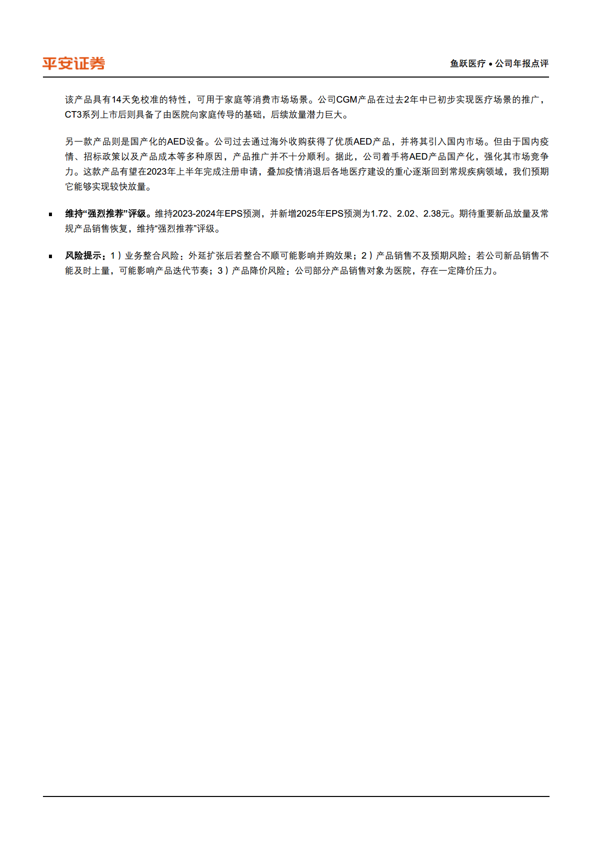 公司未来增长动力充足,新一代CGM产品CT3系列和国产化AED设备预计将陆续上市并实现快速放量。同时,随着疫情影响消退,常规产品需求将逐步回暖,预计全年收入增长将逐季加快,共同支撑公司业绩持续增长。