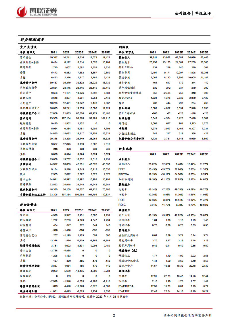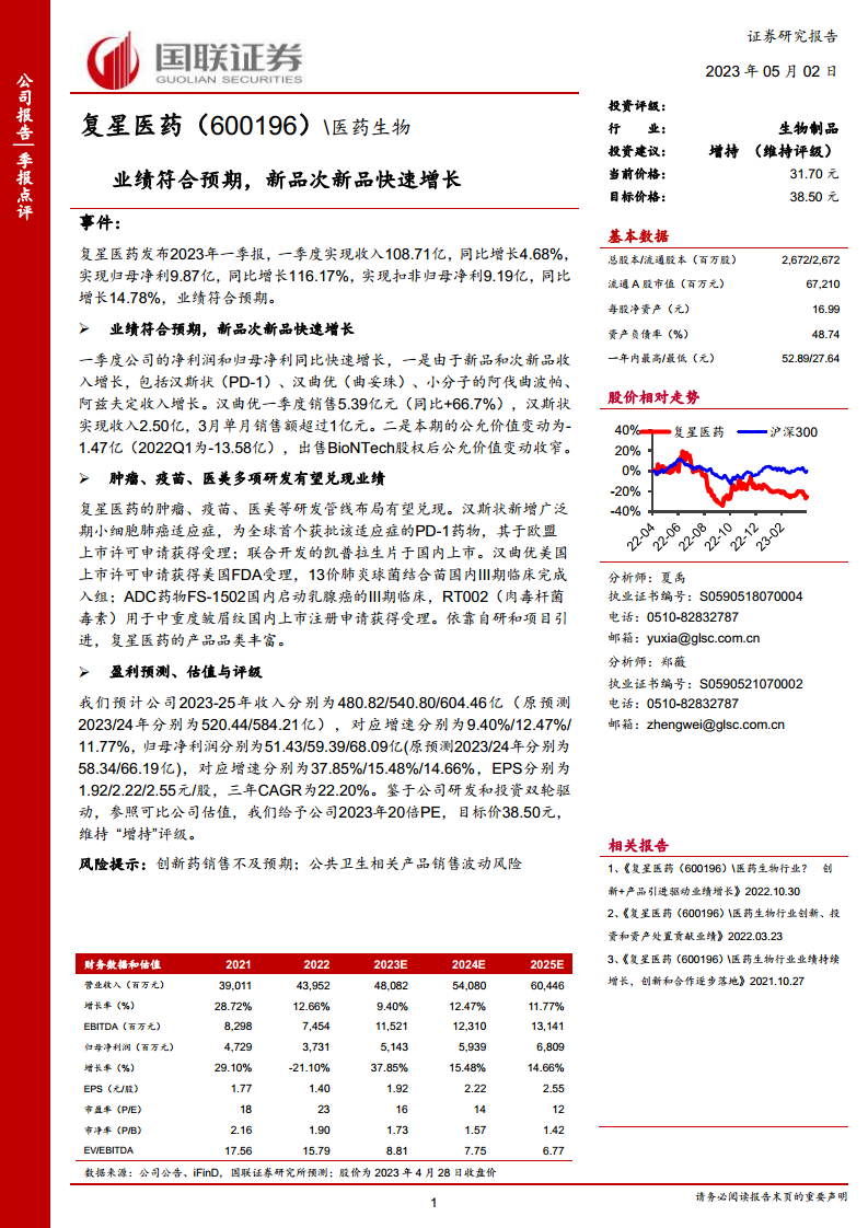复星医药在2023年第一季度展现出强劲的业绩增长势头,其收入和归母净利润均超预期增长,主要得益于新品和次新品的快速放量以及公允价值变动影响的收窄。公司在肿瘤、疫苗和医美等领域的多元化研发管线持续取得突破性进展,多项创新产品有望在未来贡献显著业绩。国联证券基于公司“研发+投资”双轮驱动的战略,对其未来盈利能力持乐观态度,并维持“增持”评级,目标价38.50元。尽管面临创新药销售不及预期和公共卫生产品销售波动的风险,但复星医药凭借其丰富的产品组合和持续的创新能力,仍具备良好的长期投资价值。
