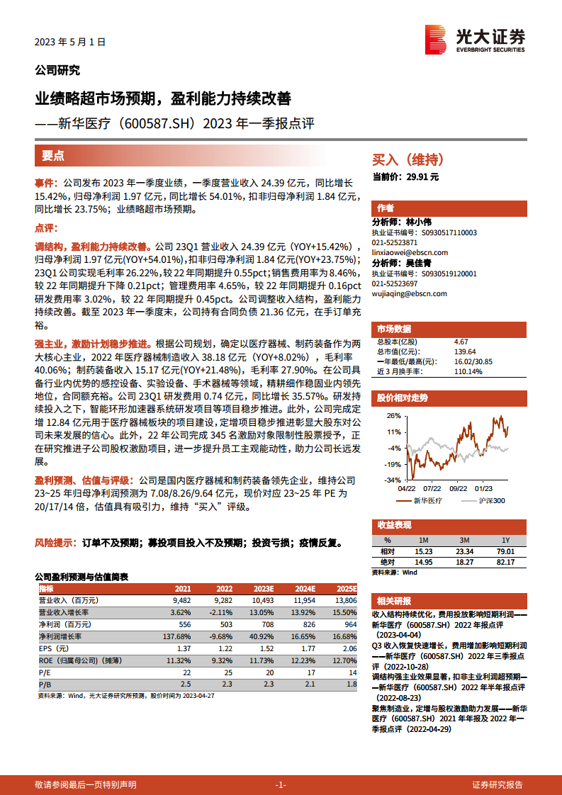 新华医疗在2023年第一季度取得了超出市场预期的业绩,营业收入和归母净利润均实现显著增长,且盈利能力持续改善。公司通过调整收入结构、优化费用控制,并聚焦医疗器械和制药装备两大核心主业,实现了稳健发展。持续的研发投入、定增项目的推进以及股权激励计划的实施,为公司未来的增长提供了坚实的基础和动力。尽管存在订单不及预期、募投项目投入不及预期等风险,但基于其强劲的业绩表现、清晰的战略规划和有吸引力的估值,光大证券研究所维持“买入”评级,并对公司未来几年的盈利能力持乐观态度。