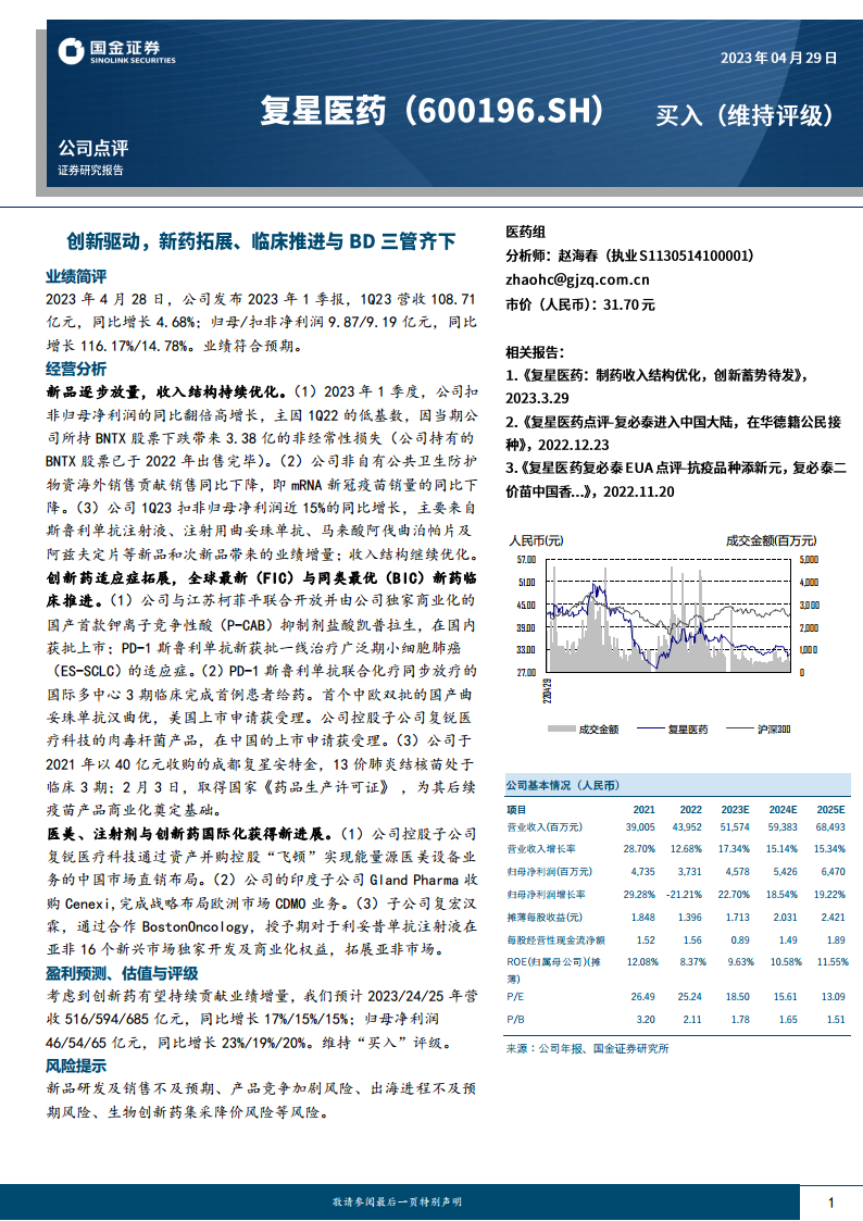 复星医药(600196):创新驱动,新药拓展、临床推进与BD三管齐下