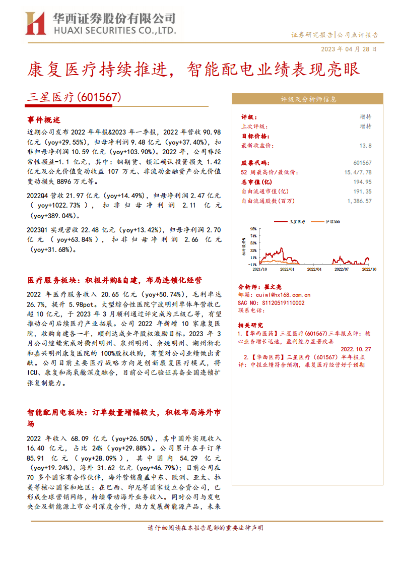 三星医疗(601567):康复医疗持续推进,智能配电业绩表现亮眼