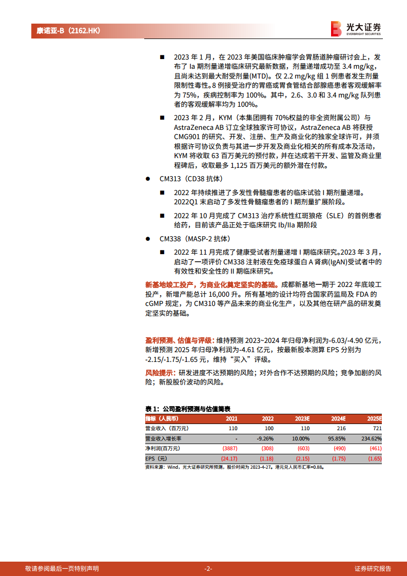 光大证券研究所维持康诺亚-B“买入”评级,并预测2023年至2025年归母净利润分别为-6.03亿元、-4.90亿元和-4.61亿元,预计亏损将逐步收窄。公司面临的主要风险包括研发进度不达预期、对外合作不达预期、市场竞争加剧以及新股股价波动等。