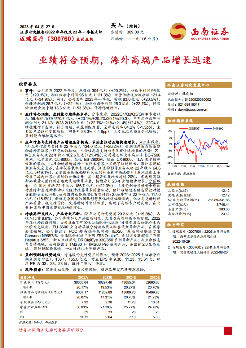在市场拓展方面,2022年国内市场收入186.7亿元,同比增长22.3%,主要受专项债资金推动医疗新基建及疫情改善影响。海外市场收入117.0亿元,同比增长16.9%,尽管面临国际复杂形势,但公司凭借过硬的产品质量和强大的性价比,在北美及发展中国家实现了高端客户突破和快速增长。公司持续高研发投入,2022年研发费用达到29.2亿元,同比增长15.8%,占收入比重9.6%。通过不断创新,公司在体外诊断领域推出了可溶性白细胞分化抗原14亚型及白细胞介素六化学发光试剂、EU 8600全自动尿液分析流水线等新产品;在医学影像领域推出了POC超高端平板彩超TEX20、专业眼科彩超“决明 ZS3 Ocular”等;在生命信息与支持领域推出了TMS30和TMS60 Pro遥测产品、易监护2.0生态系统等,持续推动产品高端化升级。基于上述表现,报告预计迈瑞医疗2023年至2025年的归母净利润将分别达到112.7亿元、136.1亿元和165.0亿元,对应的每股收益(EPS)分别为9.30元、11.23元和13.61元,并维持“买入”评级。同时,报告也提示了汇率波动、政策控费和新产品研发不及预期等潜在风险。