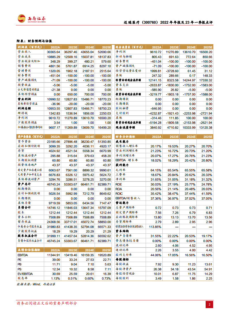 迈瑞医疗在2022年及2023年第一季度均实现了稳健的业绩增长,营收和归母净利润均保持20%左右的增速。公司盈利能力维持在较高水平,毛利率和四费率管理有效,显示出良好的经营效率和市场竞争力。
