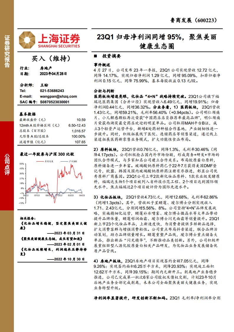 鲁商发展在2023年第一季度实现了归母净利润同比大幅增长95.09%,主要得益于资产剥离带来的投资收益。公司正坚定推进从房地产业务向“美丽大健康”生态圈的战略转型,通过剥离地产资产并更名为“福瑞达”,明确了以化妆品、生物医药和原料及衍生品为主业的发展方向。