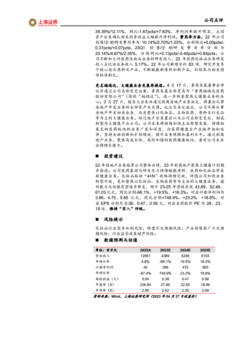 鲁商发展在2023年第一季度实现了归母净利润的显著增长,这主要得益于其战略性资产剥离所带来的投资收益。公司正坚定不移地推进向“美丽大健康”产业的全面转型,通过剥离房地产业务并更名为“福瑞达”,明确了以化妆品、生物医药和原料及衍生品为核心的发展方向。在转型过程中,医药、原料和化妆品三大核心业务板块均展现出良好的增长态势和持续的创新能力,尤其在研发投入方面持续加码,为未来发展奠定了坚实基础。尽管短期内营收因地产业务剥离而有所调整,但长期来看,聚焦高成长性、高附加值的大健康业务有望显著提升公司的盈利能力和市场估值。