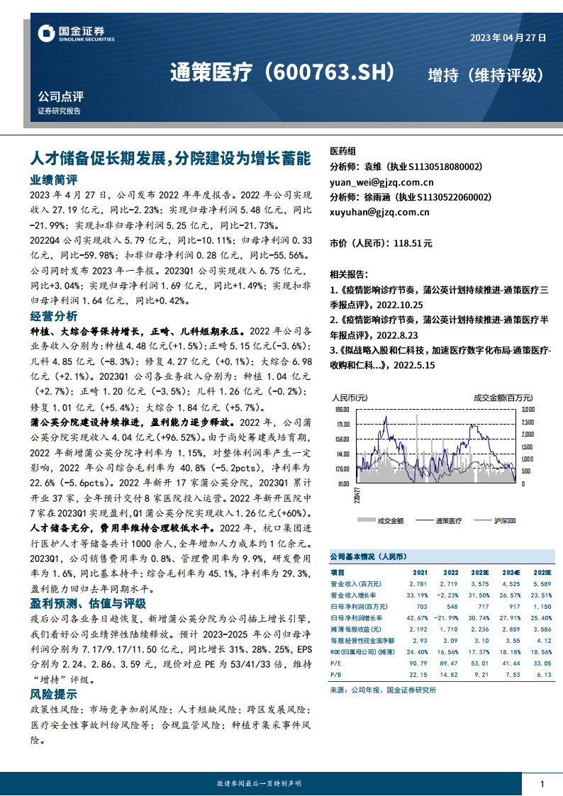 分析师认为,疫后公司各项业务将持续恢复,蒲公英分院将成为公司业绩增长的新引擎,看好公司业绩弹性释放。预计2023-2025年公司归母净利润分别为7.17亿元、9.17亿元和11.50亿元,同比增长31%、28%和25%,保持稳健增长。摊薄每股收益(EPS)预计分别为2.24元、2.86元和3.59元。