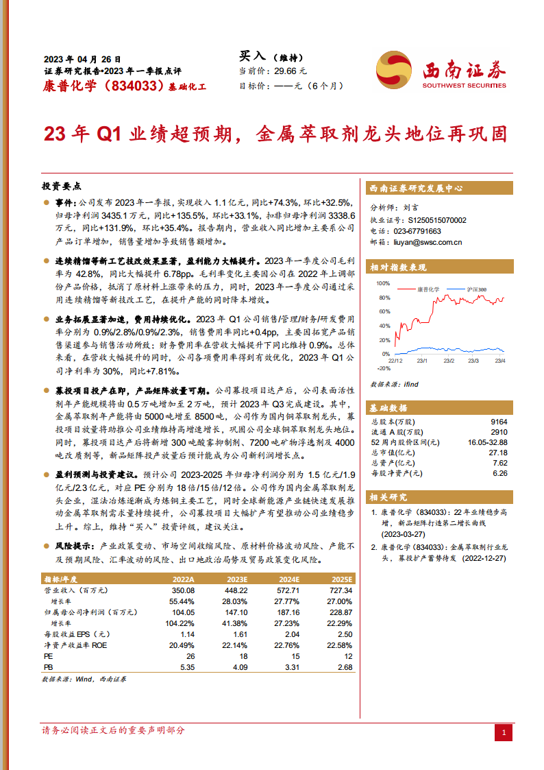 康普化学(834033):23年Q1业绩超预期,金属萃取剂龙头地位再巩固