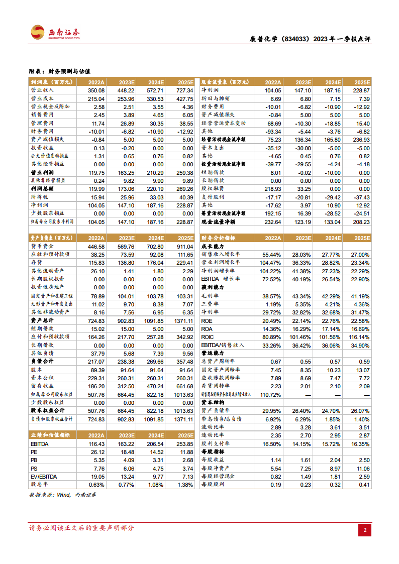 康普化学2023年第一季度业绩表现超预期,营业收入和归母净利润均实现大幅增长,同比增幅分别达到74.3%和135.5%。这主要得益于产品订单增加、销售量提升以及连续精馏等新工艺技改带来的降本增效,使得毛利率同比大幅提升6.78个百分点至42.8%,净利率达到30%。
