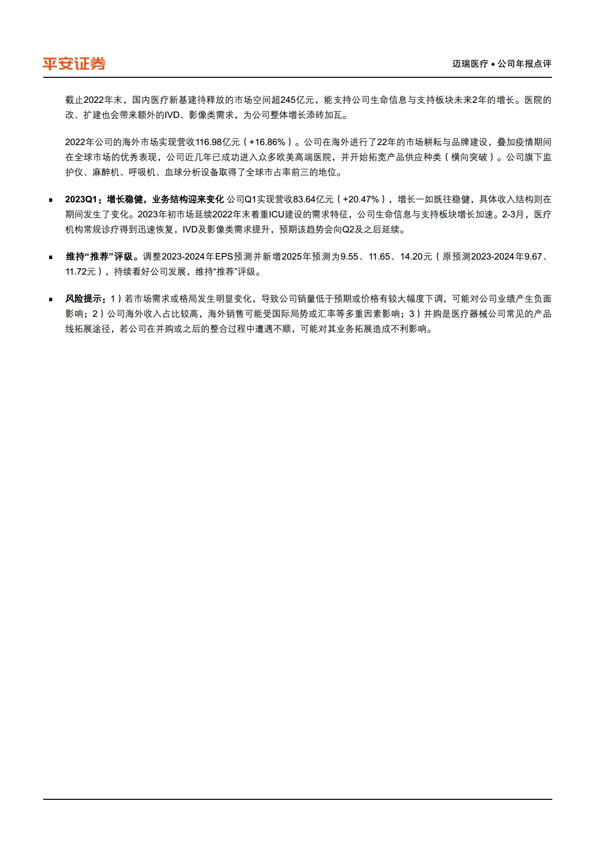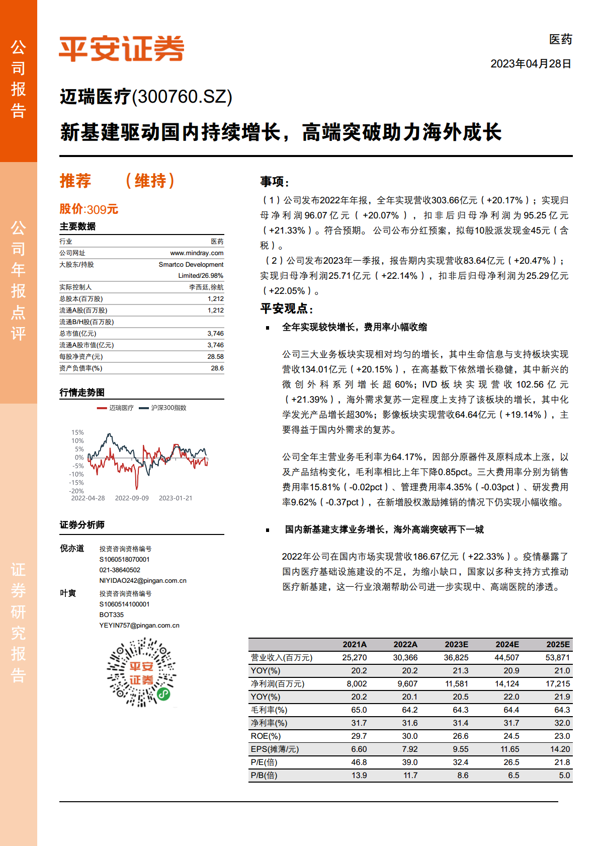 本报告的核心观点在于,迈瑞医疗在2022财年及2023年第一季度均展现出卓越的财务韧性和持续的增长势头,巩固了其在医疗器械市场的领导地位。公司通过三大核心业务板块的均衡发展,实现了营收和净利润的双位数增长,这不仅反映了其强大的市场适应能力,也凸显了其在复杂宏观环境下的稳健运营策略。尽管面临全球供应链挑战和成本压力,公司通过精细化管理有效控制了费用,确保了盈利能力的持续提升。这种稳健的业绩表现,结合其积极的股东回报政策(如高额现金分红),进一步增强了投资者信心。