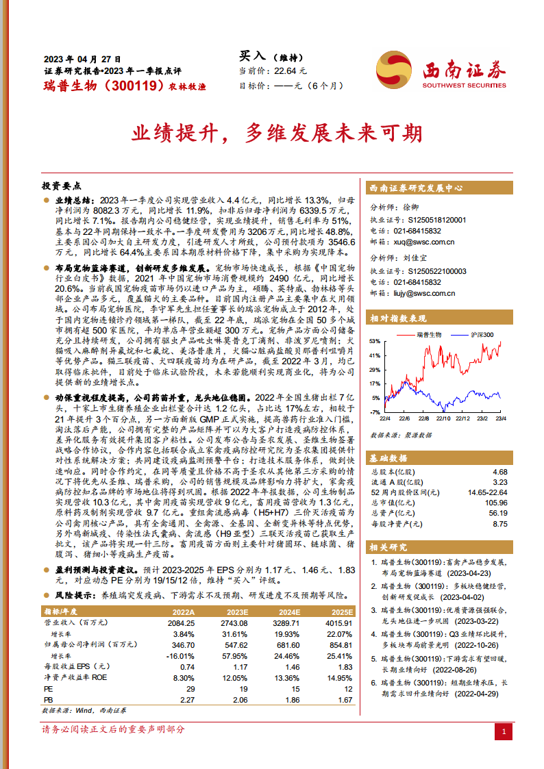 瑞普生物在2023年第一季度展现出稳健的业绩增长态势,营收和净利润均实现同比提升。公司通过加大研发投入和优化采购策略,有效提升了经营效率和创新能力。在市场布局方面,瑞普生物积极拓展宠物蓝海赛道,通过瑞派宠物构建了领先的宠物医疗服务网络,并持续推进宠物产品的研发。同时,在传统动保领域,公司凭借其全面的产品线、差异化服务以及与圣农集团的战略合作,进一步巩固了市场龙头地位。未来,随着宠物和动保市场的持续发展,以及公司在研发和市场拓展方面的投入,瑞普生物有望实现多维度的增长。分析师维持“买入”评级,但提示需关注疫病、需求及研发进度等风险。