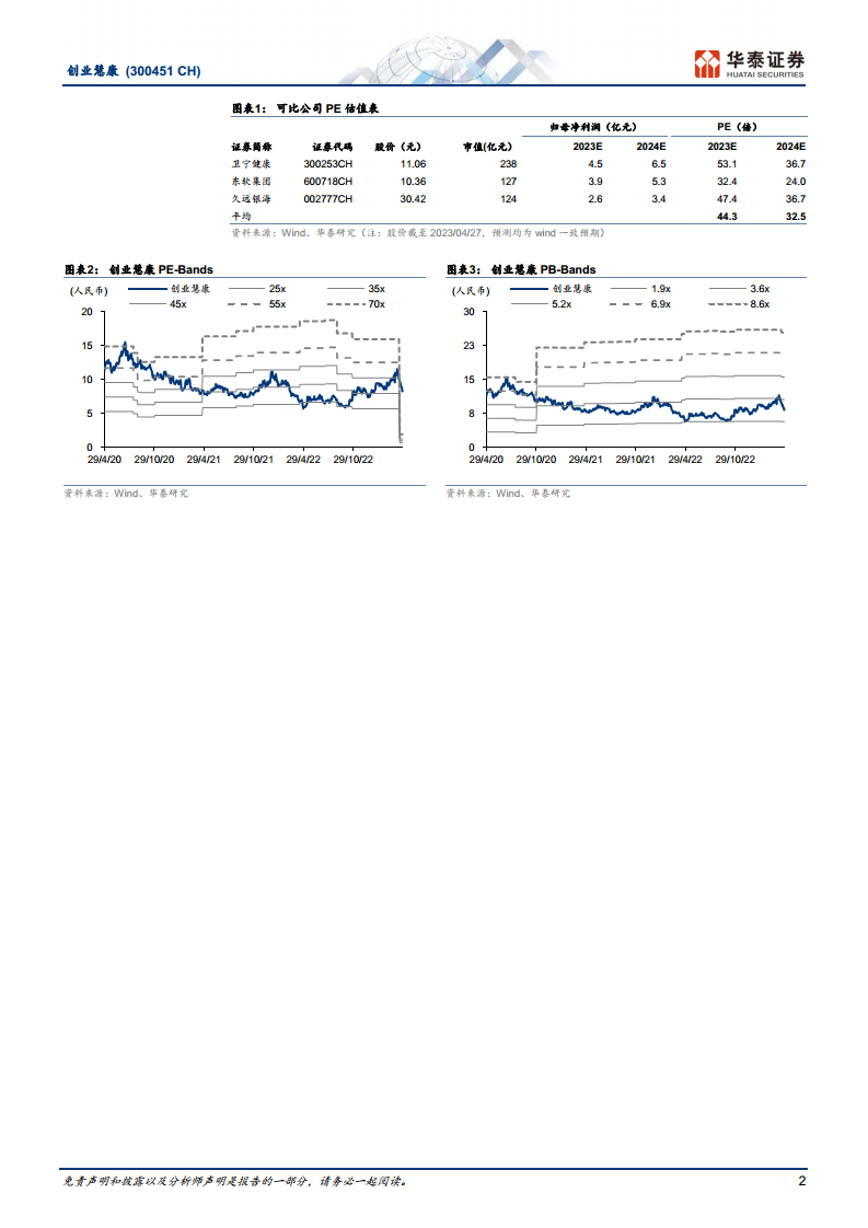报告提供了详细的经营预测指标,包括2021年至2025年预测期的营业收入、归属母公司净利润、每股收益(EPS)、净资产收益率(ROE)、市盈率(PE)、市净率(PB)和企业价值/息税折旧摊销前利润(EV/EBITDA)等关键财务数据。数据显示,预计公司在2023-2025年将实现营收和净利润的持续增长,其中2023年营业收入预计为18.82亿元,归母净利润为4.01亿元。此外,报告还列出了卫宁健康、东软集团、久远银海等可比公司的PE估值,平均为44.3倍(2023E),并展示了创业慧康的PE-Bands和PB-Bands图表,为投资者提供了估值参考。