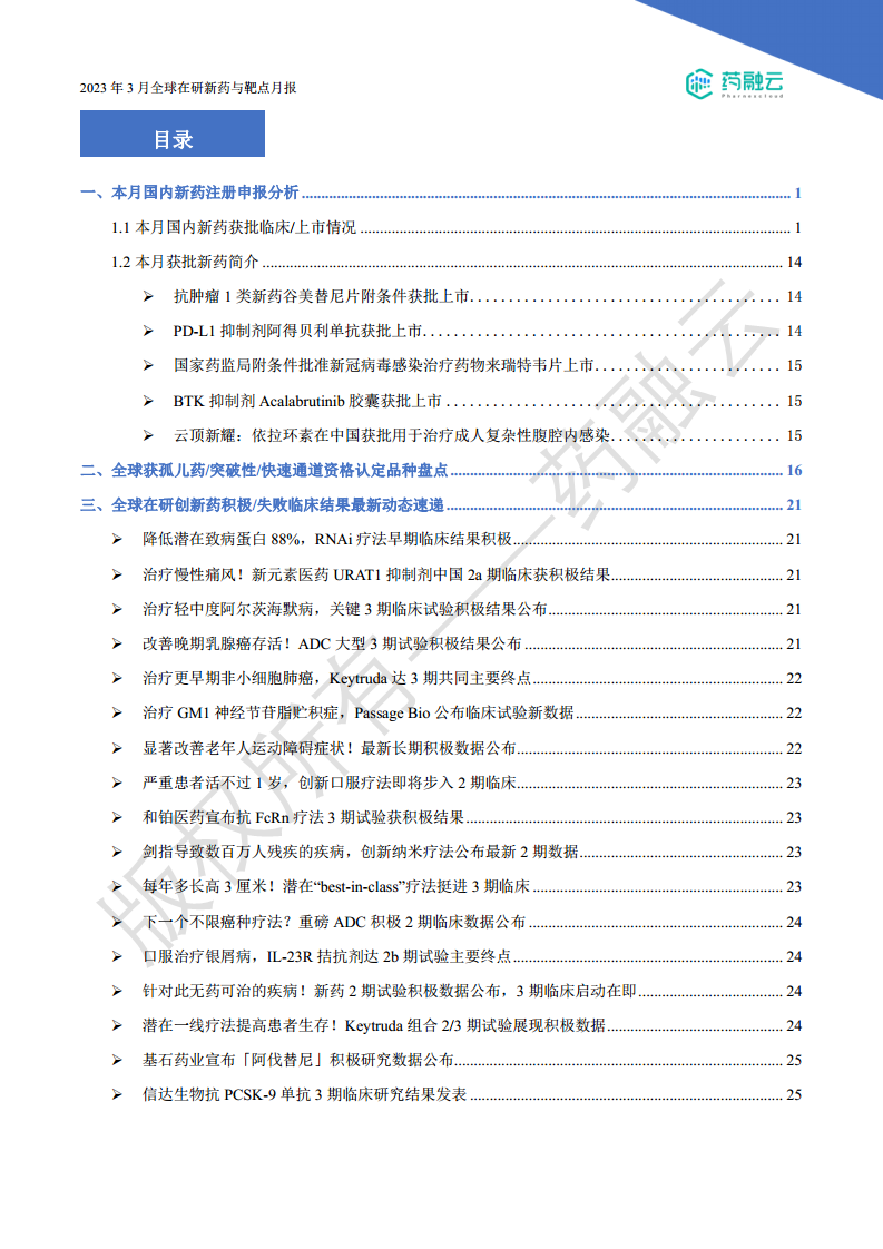 本报告的核心观点是:2023年3月全球医药市场呈现积极发展态势,创新药研发取得显著进展,国内外企业在创新药研发、注册申报和国际化方面均展现出强劲动力。具体体现在以下几个方面: